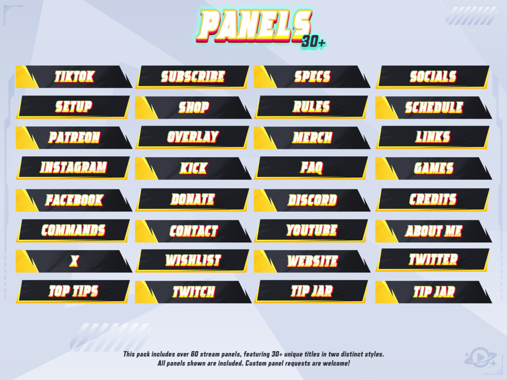 • 30x Panels (2 versions each): About me, Donate, Tip, Top Tips, Socials, Specs, Merch, Rules, etc (see gallery for full list);