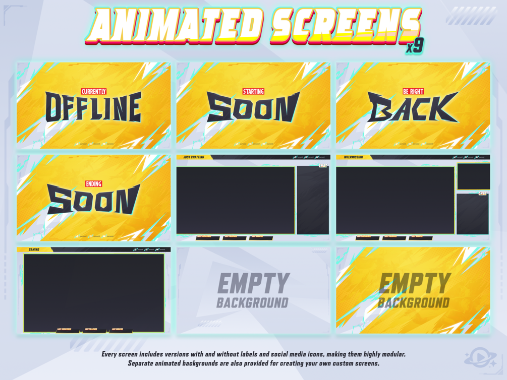 • Animated Screens: Starting, BRB, Just Chatting, Intermission, Gaming, 2x Background;