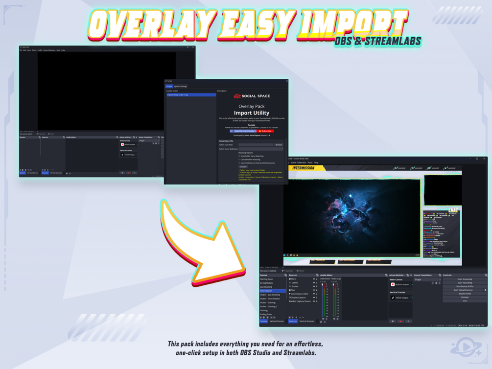• OBS Studio: We've included a unique setup script to help you import the entire scene collection in minutes, a feature you won't find in 99% of other packs!