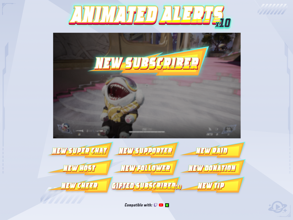 • 10x Animated Alerts: New Follower, New Subscriber, New Donation, New Tip, New Supporter, New Gifted Subscriber(s), New Raid, New Host, New Cheer.