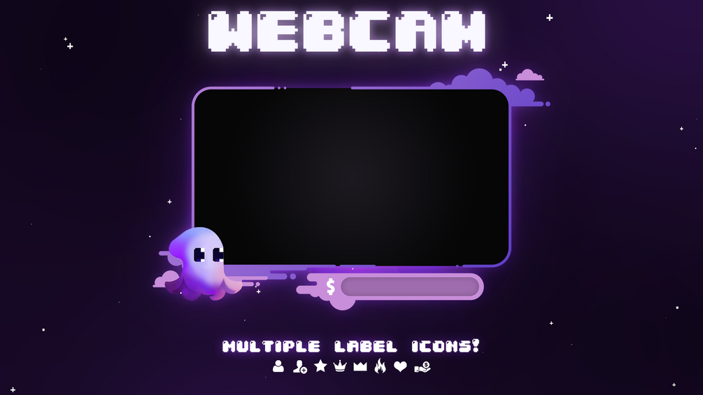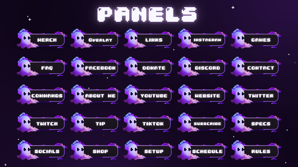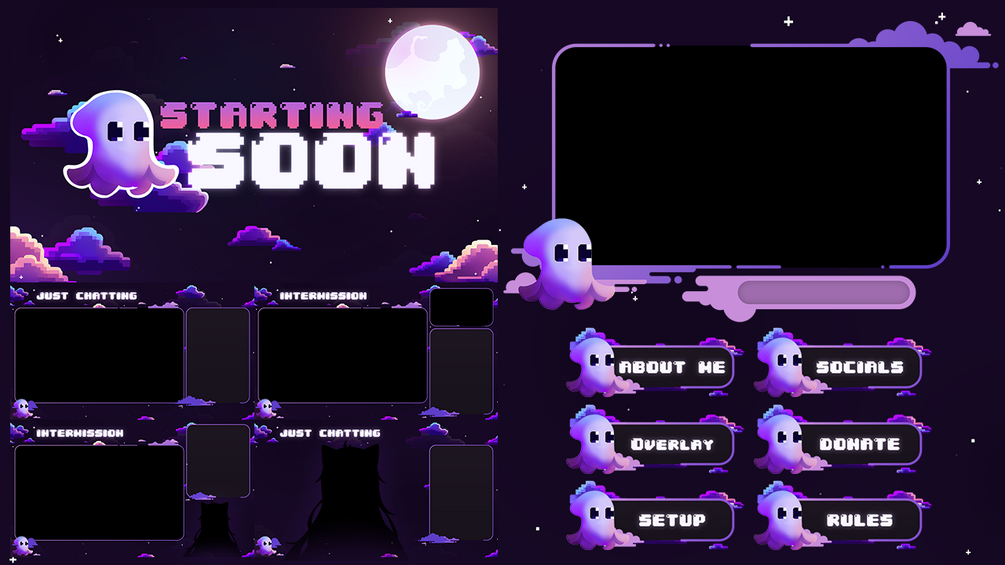 The Twitch stream overlay pack boasts an endearing Pixel Ghost design complemented by a predominantly purple color scheme and adorable cloud motifs. Expect to find various elements included in this overlay pack, ranging from webcam borders to screens and panels, all infused with the charming ghostly theme. The pixelated style adds a retro vibe to the design, while the playful purple color palette elevates the overall aesthetic. This overlay pack is perfect for streamers seeking a cute and enjoyable aesthetic for their channel!